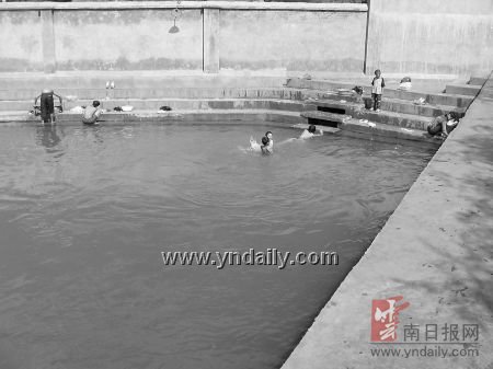 滇南武校內(nèi)有一個(gè)游泳池,但多年未用,泳池成了學(xué)生晾曬衣服的場(chǎng)地。游泳池的南側(cè)還有一池子,池內(nèi)的水就是從校外公路邊引來(lái)的龍?zhí)端3刈拥谋泵媸亲叩,地面高出水面約150厘米。池子的東、南、西3面都有臺(tái)階下到池底,學(xué)生們可以在這里洗衣服,當(dāng)然,練武的學(xué)生們也會(huì)在課后站到不深的池內(nèi)擦擦身子。