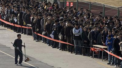 為了找工作,昨日(13日)清晨不到6時,天剛微微亮,許多大學(xué)畢業(yè)生就提前近3小時排起了長隊(duì)。