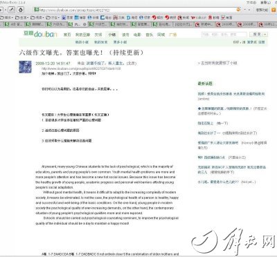 考試結(jié)束之后,記者查閱了新浪、搜狐等網(wǎng)站上刊登的六級(jí)考試試題及參考答案,發(fā)現(xiàn)與這個(gè)帖子里的試題和答案基本相符,僅有少數(shù)題目的答案稍有差異。