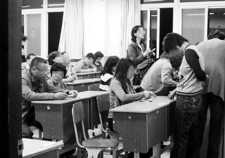 教學(xué)點(diǎn)的墻上貼著一些學(xué)生的進(jìn)步成績(jī)表,一名男咨詢員指著其中一個(gè)高三學(xué)生的名字說,這個(gè)孩子全科補(bǔ),不在學(xué)校晚自習(xí)了,家長(zhǎng)為此已投入7 萬(wàn)多元。“為了孩子的將來(lái),投入還是值得的!彼f,“孩子在學(xué)校晚自修效率不高,學(xué)校老師要管很多學(xué)生,如果你孩子不主動(dòng),老師也很難顧及到!