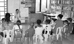郭以琳家在麗江花園小區(qū),表面上與鄰居家并無二致。一打開門,才會發(fā)現(xiàn)這個100多平米的3居室里別有天地。整個客廳都是小朋友們的“教室”,投影大屏幕是“黑板”,兩個臥房里鋪著一排被褥供孩子午睡。“我們這幾乎是個小聯(lián)合國”,郭以琳告訴記者,她家的小幼兒園開辦一個多月,已經(jīng)有10幾個學生,一到上課時間,中國孩子、美國孩子、南非孩子坐成一排,小朋友們跟自己的小國際友人玩得很開心,3歲的中國孩子就能掌握1000多個英語單詞。記者在“教室”里看到,兩個年輕的女老師一邊讓小朋友們看動畫片,一邊教他們學自然知識、英文單詞,更像是帶小朋友玩游戲而不是“上課”。