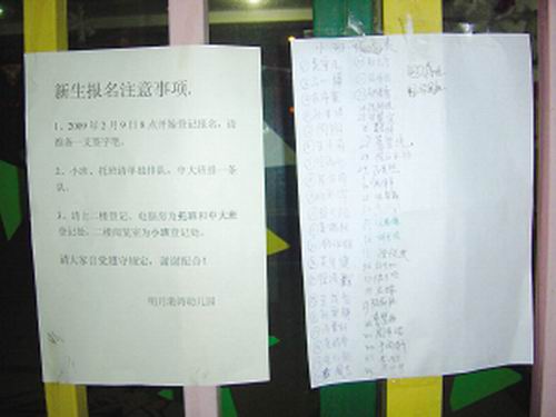 記者趕到現(xiàn)場時,看到幼兒園門前排起了上百人的隊伍,大部分人都帶著小板凳,有的甚至帶來了帳篷支在學(xué)校門口,看樣子要打持久戰(zhàn)。記者奇怪,現(xiàn)在才2月份,小孩要到9月份才能入園,有必要現(xiàn)在就排隊嗎?還冒雨。正在排隊的蘇先生告訴記者,明月港灣雙語電腦幼兒園貼出了告示,通知小區(qū)居民于2月9日早上8點到幼兒園登記報名,先到先得(號)。當(dāng)天中午,他咨詢了幼兒園,一位老師告訴他,去年幼兒園招小朋友,也是家長排隊的。如果排在后面,超過了幼兒園收生的限制,那就上不了了。蘇先生的兒子到9月份滿三周歲,就要上幼兒園了。同時蘇先生了解到,幼兒園小班是25人,但登記的人數(shù)已經(jīng)達(dá)到近50人了。蘇先生緊張起來,立刻加入到隊伍中,再朝前面一看,他排在第24位。接著就陸陸續(xù)續(xù)的有家長來排隊,到晚上8點多,隊伍已經(jīng)有上百人了。