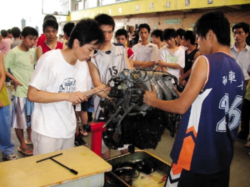 去年中秋節(jié),天津舉行了全國中職學校汽修運用技能大賽。在團體賽決賽現場,代表廣東省隊參賽的洪佳銳正與另一名隊友進行4萬公里汽車維護的項目檢測。 192項檢測,35分鐘限時,場地四周閃爍的鎂光,比賽裁判注視的目光,使洪佳銳來回跑動的雙腿緊張得顫抖不已。他穩(wěn)定一下情緒,鉆進比賽用車駕駛位,一手以手腕關節(jié)為支點、轉動方向盤,一手持直尺量度方向盤轉動角度,在車子前輪受方向盤操控轉移的剎那,洪佳銳探得方向盤轉向阻力及轉向輪度數,完成方向盤自由行程檢測步驟……