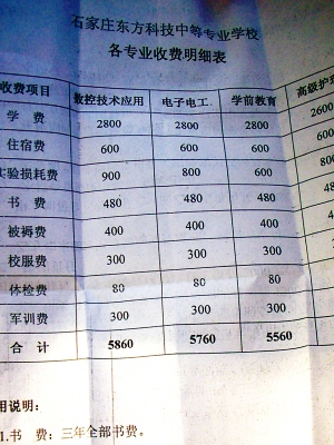 如果學(xué)生想自己找實(shí)習(xí)單位,就要交3000元錢(qián)。其中1000元是注冊(cè)費(fèi),2000元是伙食費(fèi)。“我們是與石家莊協(xié)和醫(yī)學(xué)院聯(lián)合辦學(xué)的,發(fā)的是那所學(xué)校的畢業(yè)證,注冊(cè)什么的都需要錢(qián),這個(gè)錢(qián)就得學(xué)生來(lái)出!边@位老師說(shuō),從去年5月份開(kāi)始,學(xué)校的食堂就對(duì)學(xué)生和教職工免費(fèi)開(kāi)放了。小張去年7月從廣東打工回來(lái),暑假后來(lái)上學(xué),從9月到現(xiàn)在,在學(xué)校免費(fèi)吃了7個(gè)月的飯,按每月300元算,是2100元,學(xué)校收2000元是合適的。