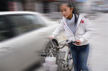 “瑤瑤,這是幾個客戶點的菜,快點送去……”中午12時剛過,李萬瑤一路小跑到家,書包還沒來得及放下,媽媽一邊翻炒著鍋中的菜一邊遞過打包好的外賣。李萬瑤將外賣碼到自行車前簍中,推車出了門。