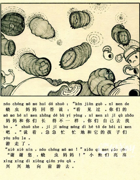 最近,關(guān)于《小蝌蚪找媽媽》原著的改編又有了新動作———有網(wǎng)友把《小蝌蚪找媽媽》的主角小蝌蚪改成了小蛆蟲,故事里原來的配角鯉魚、烏龜、白鵝則變成了蟯蟲、線蟲和屎殼郎。有一位80后的小青年還給改編的文字配上自己創(chuàng)作的情景漫畫圖,再加進(jìn)文字與拼音標(biāo)注,《小蝌蚪找媽媽》就這樣變成了《小蛆蟲找媽媽》。