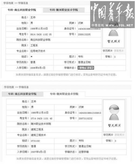 從學籍科老師處知道自己的身份可能被盜用的消息后,王帥登錄中國高等教育學生信息網(wǎng)查詢。他發(fā)現(xiàn)自己的身份下有兩個學籍信息,一個是自己2007年入學的隨州職業(yè)技術(shù)學院,另一個則顯示為:2006年9月1日入學商丘科技職業(yè)學院工程系應用電子技術(shù)專業(yè),學制三年?疲瑢W籍狀態(tài)為已畢業(yè)。后者的姓名、出生日期、身份證等信息均與自己相同,考生號則為自己第一年參加高考的準考證號。兩個學籍信息均沒有照片。