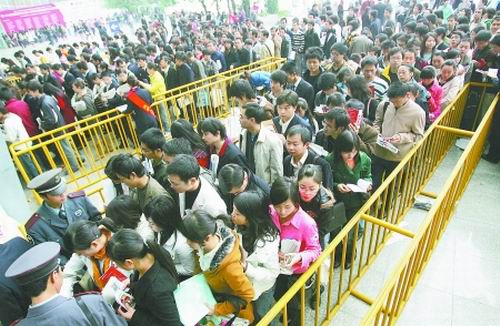 經(jīng)兩天“海選”,由成都市人事局主辦、成都人才市場(chǎng)承辦的2008成都冬季特大型人才招聘會(huì)暨高校畢業(yè)生供需洽談會(huì),昨日(11月16日)在世紀(jì)城新會(huì)展中心正式落幕。作為今冬規(guī)模最大的一次特大型招聘會(huì),今年只有324家企業(yè)攜6226個(gè)崗位前來“選秀”。盡管招聘單位和崗位數(shù)量大幅縮水,但兩天時(shí)間里求職大軍數(shù)量仍逼近7萬。