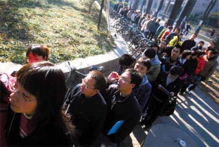 昨日(20日,下同)上午,清華大學(xué),求職學(xué)生在招聘現(xiàn)場門外排起長隊(duì)。因人數(shù)較多,校方一度限制學(xué)生進(jìn)場。到11時(shí),隊(duì)伍超過兩百米。本報(bào)記者 薛珺 攝