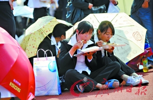 也有同學(xué)通過(guò)“暗號(hào)”聯(lián)系,如“某學(xué)院經(jīng)管班‘最佳射手’請(qǐng)到主席臺(tái)”,估計(jì)被呼叫的同學(xué)是個(gè)足球愛好者。也有同學(xué)搞惡作劇。當(dāng)廣播中有同學(xué)尋找周杰倫時(shí),全場(chǎng)一陣笑聲。還有這樣的廣播,“麻省理工大學(xué)的××同學(xué)請(qǐng)到主席臺(tái),您劍橋的同學(xué)在等您”,這在緊張的氣氛中制造了難得的笑聲! ∥/記者 徐靜 圖/記者 邵權(quán)達(dá)