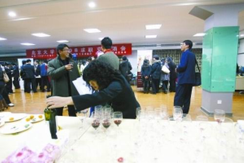 幾名學(xué)生拿著紅酒走到翰威特咨詢公司大中華區(qū)人力資源總監(jiān)朱纓面前,碰杯后,向她咨詢怎么寫求職簡歷。昨晚(12月11日),在北京大學(xué)第一體育館地下室,一場“求職交流酒會”吸引了8家企業(yè)和200多名同學(xué)參與。