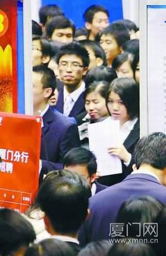 當日在廈大召開的畢業(yè)生招聘會,是廈大每年為自己的畢業(yè)生舉辦的,不過,幾乎省內(nèi)的大學都有人趕去參加,使得廈大這一年一度的招聘會首次實行門禁——依照人流量分時段放人入場,有的畢業(yè)生花了一小時才遞上一份簡歷。