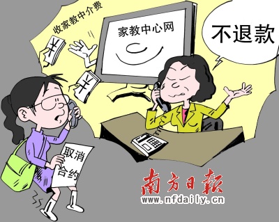 “家教中介費(fèi)怎么就易收難退?”日前,本報(bào)接到華南師范大學(xué)學(xué)生小東(化名)報(bào)料稱,在其交納中介費(fèi)后由于受教對(duì)象原因未能成功進(jìn)行家教,但家教中介公司卻以有關(guān)條款為由不予退款。