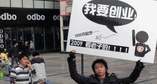 “我要創(chuàng)業(yè),1000元起步……2009,看老子的!”昨(8)日下午4時許,香檳廣場上,一名小伙子擺出一副“!奔軇荩e著自制的告示牌,喊著“自主創(chuàng)業(yè)”的口號,引來了附近路人紛紛駐足觀看。