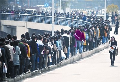 20 日,“湖北省2009年新春大型人才招聘會”在華中科技大學(xué)光谷體育館舉辦。這場招聘會是2009年春節(jié)后首場針對大學(xué)生的招聘會,近4萬名求職者擁向會場,隊(duì)伍最長時(shí)有3公里。上圖:當(dāng)天下午1時(shí)20分,一些學(xué)生投完簡歷走出體育館,而門外還聚集著大量等待進(jìn)場的學(xué)生。