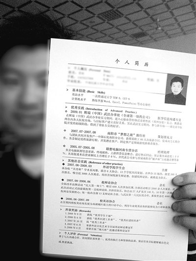 “家教、發(fā)單員……這些兼職可能都是‘大路貨’”,于是,他刪掉了這些毫無特點的經(jīng)歷,并按重要程度把簡歷分層次,又將自我評價改用實例支撐。他花了兩個月,作了近70次修改,將厚厚一沓簡歷精簡到一張紙。