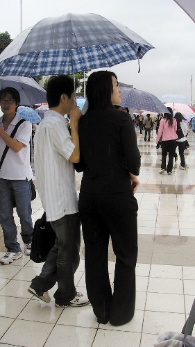 “好煩,早知道下雨就不來了,討厭!”為給面試官好印象,女大學生丹丹特地選了一套淺色條紋的套裝。但恰逢招聘會當天是下雨天,丹丹的小套裝一下就粘上了點點雨花。丹丹一邊整理,一邊對身旁負責撐傘的男友撒嬌,而男友則不厭其煩地細語安慰:“忍一下就好,快到你了……”