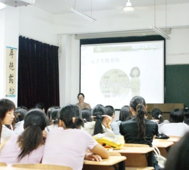 昨晚7點,在該校一間可容納90人的大教室里已坐滿了女生,有的正認(rèn)真做著筆記,有的與同伴小聲交談著。講臺上,女教師在介紹該課的主要內(nèi)容,包括女子生殖系統(tǒng)、避孕、婦科病等知識。