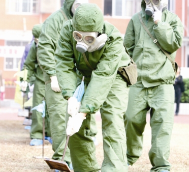 16:15 10名學(xué)生穿著防化服,拿著各種儀器小心謹慎地穿越染毒區(qū)并用白、黃、藍三中顏色標明沾染區(qū)和非沾染區(qū),以便人們安全通過。接著,有8名學(xué)生安全通過了沾染區(qū)。