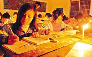 昨天(19日)下午6時(shí)40分,16歲的陳麗娟與同學(xué)們照例走入課室,從老師手中接過一支蠟燭點(diǎn)燃,當(dāng)晚,連州市西江鎮(zhèn)中學(xué)600多學(xué)生在點(diǎn)點(diǎn)燭光中,迎來了2008年新學(xué)期的第一個(gè)晚自修。