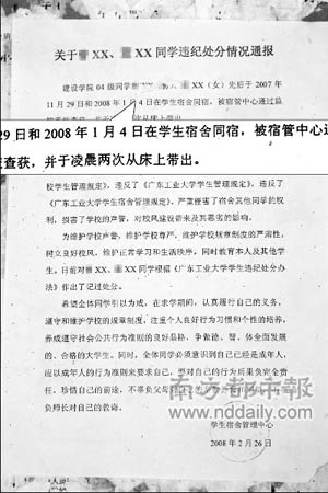 1月4日,廣州大學城某工業(yè)大學一女生留男生在宿舍過夜被學校抓獲,兩人近日被學校記過處分。這是該校在大學城校區(qū)首次對男女同宿現象公開處罰。該校宿管中心主任表示,在接下來的時間,學校還將陸續(xù)公布10多個涉及“男女同宿”的學生處罰名單。