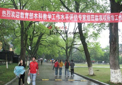 各種迎評的紅幅掛在教學(xué)樓或者人行道上,每幢教學(xué)樓門口都豎著倒計時牌,標(biāo)記著這是評估前的最后一天。學(xué)生會成員站在教學(xué)樓門口檢查;铡P@110們穿著嶄新的保安制服,騎著摩托車在四處巡邏,據(jù)說為了迎評,添置了不少人手。隨便找個什么人聊天,開口閉口談的都是“評估”。連和校內(nèi)的小店老板攀談,他也在說評估:“對面那家店,是為了迎評新開的……”