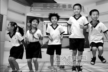 省地震科普館“試震互動區(qū)”內(nèi),孩子們跳起體驗“震級”。記者姬東攝
