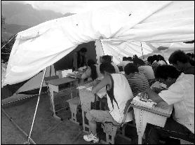 昨天下午,茂縣中學操場上架起了8個巨大的白色帳篷,帳篷上印有聯(lián)合國兒童基金會的藍色標志。每頂帳篷里都坐滿了高三學生。為了散熱,帳篷兩側都被撩起來通風。4點剛過,喧鬧的帳篷內(nèi)頓時安靜下來,其中一個帳篷里不久后傳出了一片讀書聲。旁邊的“教室”內(nèi)學生們安靜地做著卷子。記者悄聲問坐在帳篷邊的一位女生上什么課,她悄聲回答:“地理。”