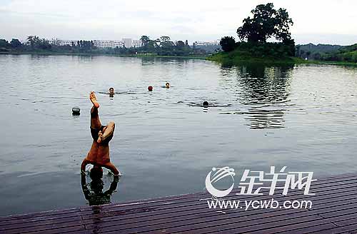 一位剛從水里鉆出來(lái)的學(xué)生證實(shí)了上述推斷:“不少市民傍晚會(huì)專門(mén)開(kāi)車來(lái)這里游泳,周末岸邊都停滿了外面來(lái)的小車!彼f(shuō),學(xué)校的游泳池開(kāi)放時(shí)間有限制,而且要收費(fèi),自認(rèn)為“水性好”的同學(xué)都樂(lè)意到中心湖游泳,“只要不下雨,這里的‘人氣’都很旺”。
