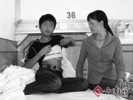 據(jù)阿強(qiáng)回憶,今年6月12日晚,他在文山南鷹學(xué)校內(nèi),因多了一句嘴即被其班主任陳老師痛打。當(dāng)日晚9點(diǎn)多,晚自習(xí)后,阿強(qiáng)和其他同學(xué)一起回宿舍拿洗漱工具到水管處洗臉腳,后按常規(guī)到校內(nèi)一斜坡空地集合接受老師清點(diǎn)人數(shù)時(shí),班主任陳老師宣布還要進(jìn)教室上自習(xí),有幾名學(xué)生因此不滿(mǎn),阿強(qiáng)也跟著叫了一句:“如果這樣補(bǔ)晚自習(xí)的話,那還不如每天晚上都到12點(diǎn)鐘才睡覺(jué)!彪S即遭到陳老師一陣痛打……“我當(dāng)晚睡覺(jué)就感到左胸部疼了!”阿強(qiáng)告訴記者:“我被打的第二天,因?qū)W校按常規(guī)放假即回了遠(yuǎn)在西疇的家,回家后也不敢和父母說(shuō)被老師痛打的事;返回學(xué)校后,我告訴陳老師我被他打的部位還疼,陳老師告訴我要過(guò)一段時(shí)間才會(huì)好!敝敝6月23日,阿強(qiáng)疼得受不了,才向老師提出要打電話叫母親來(lái)接他離校檢查,后經(jīng)同意才得以向家人說(shuō)出實(shí)情……