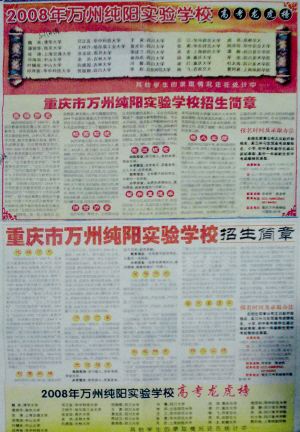 昨日,萬州多所學(xué)校老師向本報(bào)投訴稱,該區(qū)純陽實(shí)驗(yàn)學(xué)校造假,編了一個(gè)叫魏來的考生,在報(bào)紙上打廣告說他考上了清華大學(xué)。記者注意到該招生廣告分兩部分,上面是“2008年純陽學(xué)校高考龍虎榜”,下面是招生簡(jiǎn)章的具體情況。龍虎榜上是該校今年高考錄取動(dòng)態(tài),包括學(xué)生姓名和錄取院校。其中排在榜首的叫“魏來”,錄取院校是清華大學(xué)。廣告在本月14日和16日兩天刊登,一時(shí)間純陽實(shí)驗(yàn)學(xué)校今年有學(xué)生考上清華大學(xué)的消息,成為當(dāng)?shù)睾芏嗉议L(zhǎng)和市民的談資。萬州某中學(xué)一位不愿透露姓名的中干說,一些家長(zhǎng)就此拿著報(bào)紙罵他們,有那么多好的生源卻教不出“北大”、“清華”來,他們感到很是委屈。