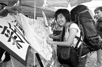 在蔣方舟為自己準備的上學裝備中,一整套自己寫的書成了必備品。“也許以后接受采訪時要用,以防不備吧!北M管一再說自己對新生活誠惶誠恐,但她顯然要比更多同齡人見過大世面。在新聞系為新生準備的T恤上簽名時,蔣方舟也完全沒有像其他新生那樣羞澀。