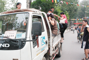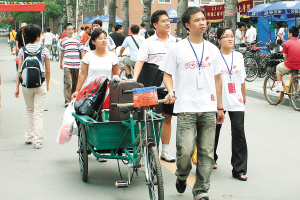 天津大學(xué)“新生報到處”所在的教學(xué)樓門前,整整齊齊地停著一排面包車、小貨車,每輛車上都貼著“迎接新生專用車”等標志。新生登記后,高年級志愿者就會幫他們將隨身行李裝上汽車。能容納五六個人的面包車塞下行李之后,載上新生一家三口,一般就再也擠不下人了。從老師們口中得知,僅僅昨天上午,他們就在兩地往返了二三十次。
