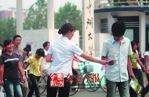上午11時(shí),發(fā)放點(diǎn)移到中州大學(xué)和鄭州師專(zhuān)門(mén)口,正在報(bào)名的學(xué)生和家長(zhǎng)明顯增多,看到計(jì)生人員發(fā)宣傳資料,很多學(xué)生主動(dòng)圍了上來(lái)。