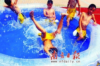 開學(xué)當天,“汶川班”學(xué)生下課后,在充氣型游泳池里玩得不亦樂乎。