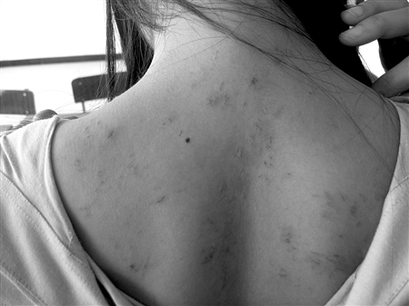 剛開學(xué)不久,四川省弘博中等專業(yè)學(xué)校新生羅珊只是身上少數(shù)部位出現(xiàn)了紅疙瘩,她以為是被蚊子叮咬也就沒(méi)放在心上。可隔了幾天寢室里的8名同學(xué)都陸續(xù)長(zhǎng)滿了“紅包包”,大家才開始著急起來(lái)!疤貏e是襠部、腿部等隱秘部位,一出汗又痛又癢,又不方便撓!迸⒂行┎缓靡馑嫉卣f(shuō)。記者見到女孩背部紅了一片,癥狀較輕的脖子竟已經(jīng)被撓壞。因?yàn)閷W(xué)校為封閉式管理,學(xué)生們并沒(méi)有到醫(yī)院醫(yī)治,只到衛(wèi)生站診治了一下或僅是簡(jiǎn)單地涂了些外用藥。