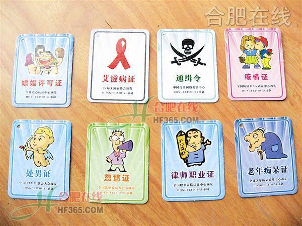 合肥市永紅路小學(xué)五年級(jí)的女生小張最近比較煩,她說:“天天有男生追著我們女生發(fā)‘恐龍證’,我已經(jīng)收到了4張證書,真是煩死了!痹瓉,近日一種惡搞證件在他們學(xué)校悄悄流行開來,內(nèi)容包括“艾滋病證”、“光棍證”、“老年癡呆證”等!昂枚嗤瑢W(xué)到學(xué)校門口的小店里買了這些證回來亂發(fā),誰要調(diào)皮就給他一個(gè)‘流氓證’!毙埲缡钦f。一位來學(xué)校接孩子的家長(zhǎng)氣憤地告訴記者:“我兒子居然有個(gè)‘泡妞證’,孩子們年齡小,對(duì)很多事情還處于懵懂狀態(tài),校園里出現(xiàn)這種不良物品,肯定會(huì)影響他們的身心健康。”很多家長(zhǎng)對(duì)此憂心忡忡,擔(dān)心孩子學(xué)壞,同時(shí)他們也認(rèn)為商家售賣如此低俗的惡搞證件是一種不負(fù)責(zé)的行為。在采訪中記者了解到,還有一些父母對(duì)孩子是否玩這種證件并不知情,都表示晚上回去翻翻孩子的書包。一位孩子家長(zhǎng)在看到證件時(shí)驚訝地瞪大了眼睛,直說:“太恐怖了,太恐怖了……”