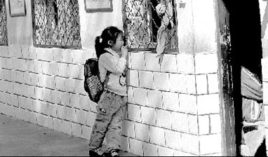 從9月17日開始,郭曉曉開始了另一種“上課”方式。她照例每天6點(diǎn)鐘起床,穿上爸爸買的廉價(jià)橘紅色運(yùn)動(dòng)服,走路到濱河路小學(xué)上課。唯一不同的是,她始終站在教室外面。