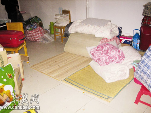 記者程翔報道:昨晚,湖北經(jīng)濟學院眾多學生因無床可睡,只好打地鋪度過漫漫寒夜。“你看,這就是我們的寢室,床都被拆走了!弊蛲7時30分許,一名女學生指著一片狼藉的宿舍對記者如是說(如上圖)。據(jù)她介紹,宿舍住的是該校會計學院自考班大二的學生。大一的時候,她們住在東湖邊的濱湖校區(qū)。今年9月,學校下發(fā)通知,稱已在該校大門對面商業(yè)街旁修好了幾棟宿舍,讓她們搬過去。