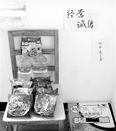開(kāi)業(yè)次日,記者在現(xiàn)場(chǎng)看到:一張小凳上擺著9袋方便面和礦泉水,旁邊是一個(gè)簡(jiǎn)易投幣箱。
