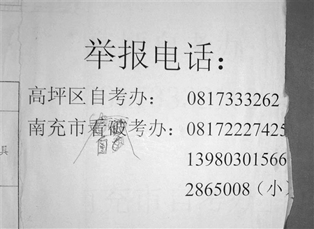 記者查了南充市黨政機關(guān)電話號碼簿,沒有發(fā)現(xiàn)這單位。記者按公布的投訴電話撥過去,被告知“我們不是看破考辦”。高坪區(qū)自考辦在教育局辦公大樓二樓,記者又趕到高坪區(qū)自考辦。“‘南充市看破考辦’根本不存在,怎么會有這個單位?”自考辦干部陳老師說。