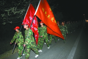 “日落西山紅霞飛,戰(zhàn)士打靶把營歸”,昨日傍晚,36名少年身著迷彩服,齊聲唱起歌,隊伍沿101國道向順義城區(qū)方向走去。指揮車內(nèi),帶隊副校長李廣德嗓音沙啞,向隊伍通告路線方向和距離。遠(yuǎn)足隊伍最先到達(dá)北京密云,途經(jīng)懷柔,到達(dá)順義,昨日行進(jìn)43公里。