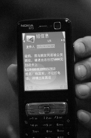 陳女士昨天對記者說,11月29日凌晨4時(shí)38分,她收到一條短信,上面寫著:“爸媽,我與朋友同居被公安抓住,請速去農(nóng)行打5800元到這卡上6228480461008157913,姓名:楊國軍,不讓打電話,詳情出來再說!倍l(fā)送人竟然是一個(gè)陌生人的號碼:13529330385。陳女士告訴記者,她女兒阿燕(化名)在肇慶某職業(yè)技術(shù)學(xué)院讀大一,由于之前已提前向她提醒說至少有四五名學(xué)生的家長都收到了這條短信,因此她并沒有再理會(huì)。