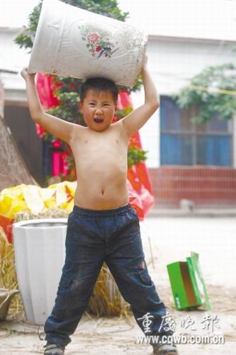 “那個娃兒在干啥喲?”隨著尖叫聲,幾名男女老師快步趕到面前。一見是徐緯,不約而同笑稱:“原來是我們的小小大力士又在表演了!