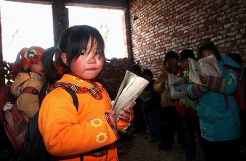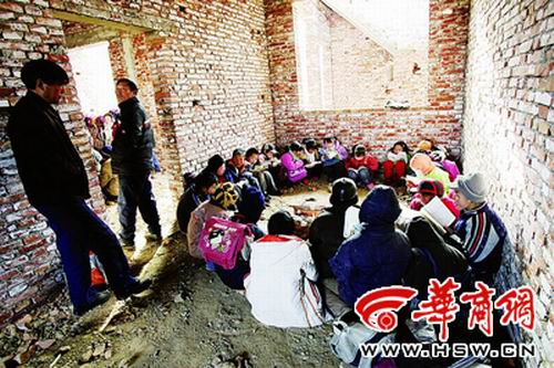 上午10時許,距董廟小學(xué)200米的地方傳來讀書聲。這是剛砌好不久的磚房,沒窗也沒門,學(xué)生分別待在幾個房間里,四下漏風(fēng),穿棉襖還是冷,大家圍成圈不停地跺著腳。老師用磚搭個簡易爐,燒些樹枝讓大家能感覺點(diǎn)暖意。“這種地方的確不能上課,總不能耽誤學(xué)業(yè),只好先找個地方解決了!崩蠋熣f。