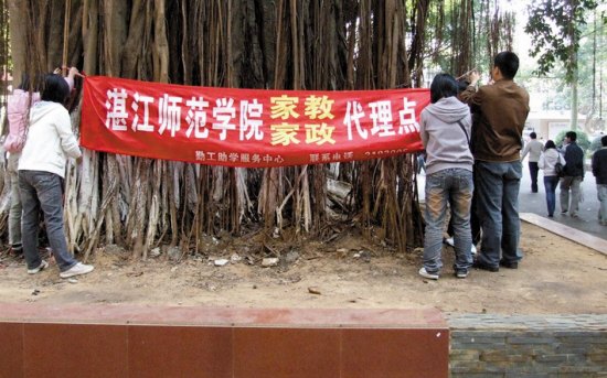 據(jù)了解,湛江師范學(xué)院勤工助學(xué)服務(wù)中心設(shè)有家政部和熱線電話,從周一至周日每天上午到下午,都有學(xué)生干部義務(wù)接聽(tīng)電話,為雇主提供服務(wù)。而校外也有企業(yè)打出“大學(xué)生家政服務(wù)”牌子招攬業(yè)務(wù)。不過(guò),學(xué)校與企業(yè)的目的不同,前者是為了幫助困難大學(xué)生渡過(guò)難關(guān),而后者則是以贏利為目的。