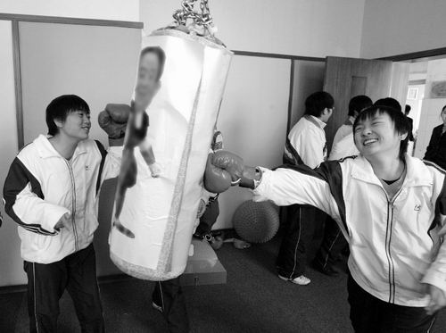 25日,記者走進(jìn)陽光心靈驛站,黃色和藍(lán)色相間的墻面讓這個房間顯得格調(diào)平和而優(yōu)雅。驛站由陽光工作室、心理宣泄室、心理放松室三部分組成。站內(nèi)還提供了諸如宣泄皮人、臉譜、放松球、沙袋及拳擊手套等宣泄工具,配備專業(yè)教師7名。記者注意到,該校分管學(xué)生的副校長孟凡祥和3位級部主任的頭像也上了沙袋,學(xué)生們打起來毫不手軟。