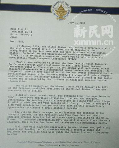 新民網(wǎng)29日致電該女生所在的成都市實驗外國語學(xué)校,分管德育工作的副校長李俊說,該校高一女生李紫子獲邀參加奧巴馬就職典禮確有其事,但發(fā)出邀請函的單位并不是美國國會,而是國會下屬的一個名為“全球青少年領(lǐng)袖論壇”(the Congressional Youth Leadership Council)的青少年組織。去年8月,李紫子因參加了該組織舉辦的比賽并表現(xiàn)出色,因此才會收到邀請函。