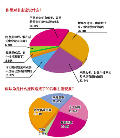 18歲未婚先孕、用避孕套來當作耳環(huán)、大街上穿露股裝……面對“90后非主流一族”令人憂心的表現(xiàn),昨日(12月29日),某網(wǎng)站進行了“是什么原因造成了90后非主流現(xiàn)象”的多項調(diào)查,5000名網(wǎng)友參與投票,網(wǎng)友們認為這一現(xiàn)象的產(chǎn)生有6成原因來自社會和家庭。