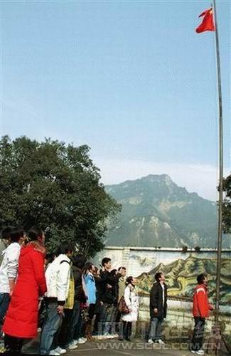 在漢旺東汽中學操場上,堆滿了一堆廢墟。在學校圍墻正中央,是一幅2米多寬的萬里長城的國畫。國畫前,一面國旗在風中飄揚!巴瑢W們,我們一起在這里,舉行一個升國旗儀式,怎么樣?”鄧莉老師的建議很快得到了同學們的贊同。同學們不約而同地站在國旗前,一只手緊貼著胸膛,對著國旗行注目禮。這時,黃沛和茍明強兩位同學站在國旗下。黃沛雙手輕輕抓住升旗的繩子,茍明強右手抓住國旗的右上角,順風放手。11:08,在丁楠杰的領唱下,同學們像往常一樣,站在旗桿下,用哽咽的聲音斷斷續(xù)續(xù)地唱著國歌,看著國旗緩緩升向天空,許多同學激動得一時很難再往下唱。